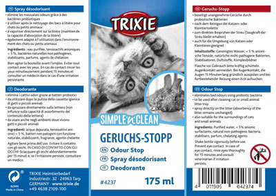 ازبین برنده بوی ظرف خاک گربه تریکسی 175 میلی لیتر، اسپریی است که برای از بین بردن بوی بد ادرار و مدفوع گربه از ظرف خاک طراحی شده است. این اسپری دارای فرمولاسیونی منحصر به فرد است که باکتری های مولد بو را از بین می برد و بوی مطبوعی در محیط پخش می کند.